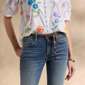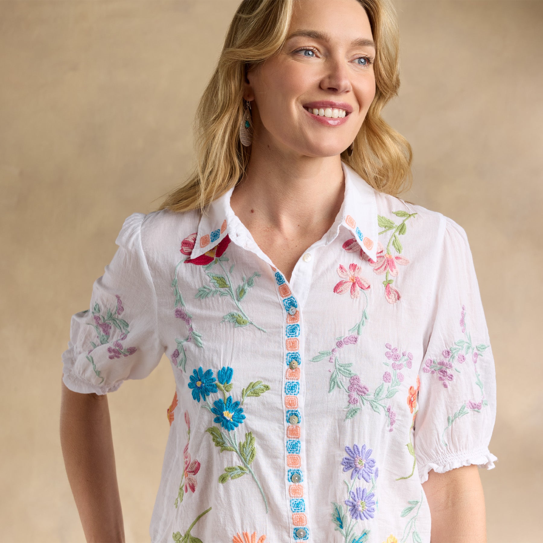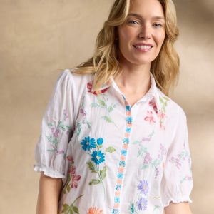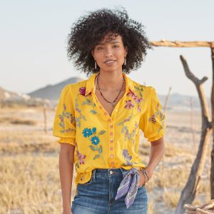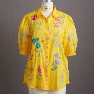 This gorgeous. collared. button-front shirt just exudes happiness with its rich color. allover embroidery. and short blouson sleeves with elastic cuffs and tiny ruffles. Shirttail hem. Cotton. Machine wash. Imported. Sizes XS (4). S (6). M (8–10). L (12). XL (14). XXL (16). Approx. 25.5l.