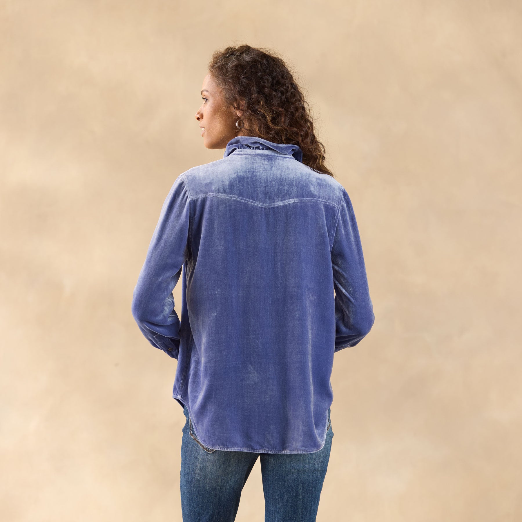 This Western inspired. soft velvet shirt is beautiful with ruffles at the neckline for a feminine twist. Two patch pockets. snap closure and bandana print detail inside. Viscose/silk. Dry clean. Imported. Exclusive. Sizes XXS (00). XS (0–2). S (4–6). M (8–10). L (12–14). XL (16–18). Approx. 24l.
