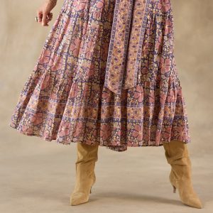 This handcrafted maxi dress features a metallic floral print with contrasting border print. elbow-length puff sleeves. a pull-over style and a self-tie belt. Cotton. Machine wash. Imported. Sizes XS (0?C2). S (4?C6). M (8?C10). L (12?C14). XL (16?C18). XXL (20?C22). Approx. 54l
