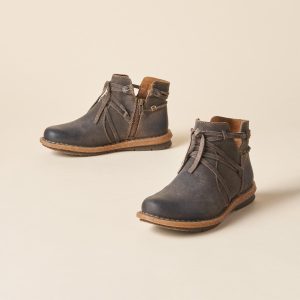 Step up to the ruggedly chic look of these ultra-comfortable. suede chukkas with crisscross. leather laces over cutaway sides and extra-flexible rubber and cork soles. suede/leather/rubber/cork. By Born. Imported. Whole and half sizes 6-10. 11. 1 heel. These boots are running a 1/2 size small.